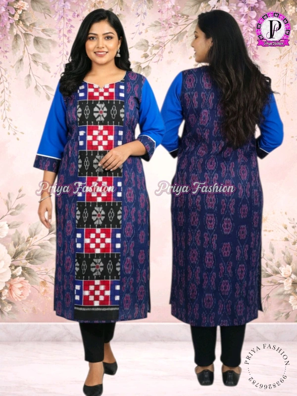 An amazing range of women kurti in soft and solid colors that looks perfect for regular wear. With beautiful designs and patterns. These apparels are very stylish and comfortable too. Get rid of the 'regular' look this season wearing Suit Set by Priya Fashion. With a perfect blend of comfort and traditional style, This Sambalpuri Cotton Kurti From Priya Fashion embellished with Buttons.Stiching from Priya Boutique...