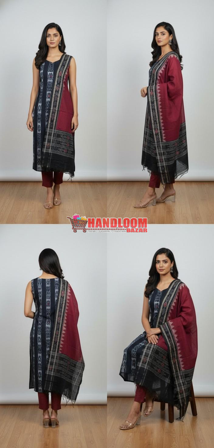 Bring home the timeless elegance of Odisha’s rich Sambalpuri handloom heritage with this Sambalpuri Handloom Cotton Ikkat Unstitched Salwar Suit Dress Material with Dupatta, exclusively available at Handloom Bazar.